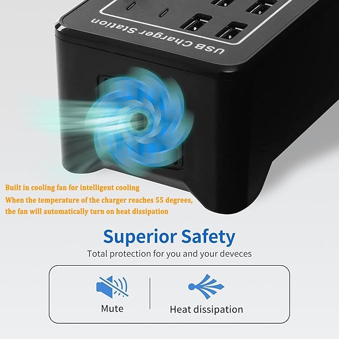 - ๐Certified Safe : Multi Protect safety system and UL certification ensure complete protection for you and your devices. Worldwide 100-240 volt AC input voltage.When the surface temperature of the charger shell reaches 55 degrees, the intelligent heat dissipation fan automatically turns on for heat dissipation protection.