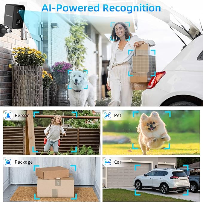 - 【AI Powered & PIR Motion Sensor with Siren】The wireless security camera supports AI & PIR detection with siren that can recognize people, pets, packages or cars, which ensures accurate detection and fewer false alarms. Stay informed and react promptly to potential security threats, enhancing the overall safety of your surroundings.