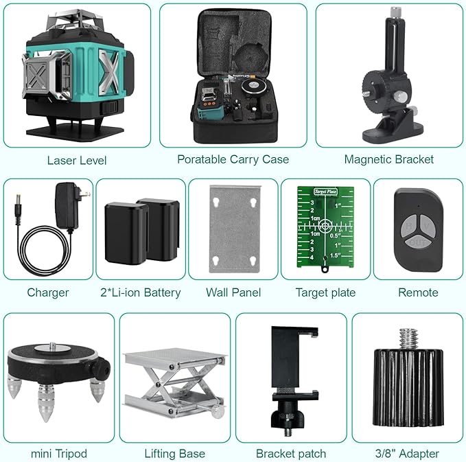 - 【Durable Design and Package Contents】16 line laser level with IP54 waterproof/dustproof to ensure that you can work normally and stably under complex working conditions,The package includes 1x16 Lines Laser Level Tool, 1x Carry Bag, 1x Power Charger, 1x 1/4”Tread Mount, 1x 5/8-20" Tread Mount, 1x Wall panel, 1x User Manual, 1x Remote Control, 1x Green Target Plate, 1x Wall Bracket, 1x Lifting Platform, 2 Batteries.