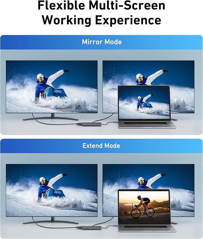 - [Expand Your Display Options] The USB dock enables dual-display functionality for your laptop by simultaneously connecting to both VGA and HDMI.It offers both MIRROR and EXTEND modes, enhancing the efficiency of your work. (๐When connecting 2 monitors through both HDMI and VGA in Extend Mode, the 2 external screens will only display the same content.)