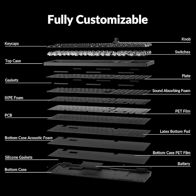 - Hot-Swappable - Every detail matters for a personalized typing experience, that’s why we give you the power. You can hot-swap every switch on the Q6 Max with almost all of the 3pin and 5pin MX style mechanical switches on the market (including Cherry, Gateron, Kailh, Panda, etc.) without soldering required. You can customize your own typing experience in seconds.