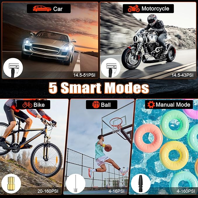 - 【One-Click Smart Inflation – 5 Presets + Auto Shut-Off】Inflating made easy. Choose from 5 inflation modes (Car, Bike, Motorcycle, Ball, Custom), set your desired pressure, and press start. The digital LCD display shows real-time pressure and auto-stops when target PSI is reached—no guesswork or over-inflation.