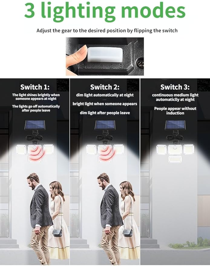 - 【Three Adaptive Lighting Modes】: Cater to various outdoor scenarios with our versatile lighting modes: full brightness on motion detection, a constant low light, or a dim setting with motion-triggered full brightness. It can provide the perfect lighting for your porch, backyard, front door, garage, driveway, walkway, steps and more, and even prevent thieves from entering your door to steal things, giving customers confidence in their safety