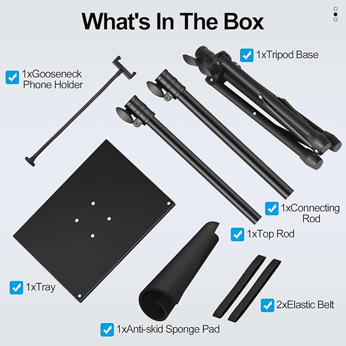 - [What' s in the Box] 1 x Tripod Stand, 1 x Tray, 1 x Gooseneck Phone Holder, 1 x Instruction, 1 x Anti-skid Sponge Pad, 2 x Elastic Belt, 1 x Storage Bag.Besides the essential premium products, OUKMIC brand offers professional guidance and fast customer service.