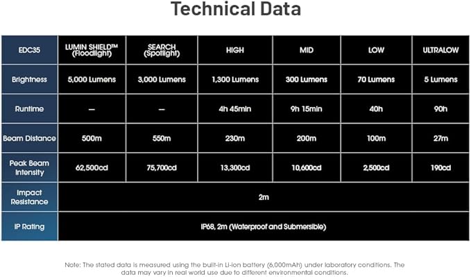 - POWERFUL EDC FLASHLIGHT - The Nitecore EDC35 flashlight delivers a super bright beam of up to 5000 lumens with a range of 601 yards.