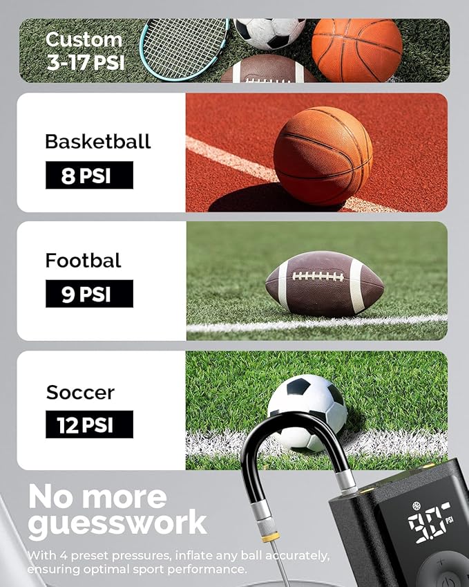 - FOUR PRESET INFLATION MODES: The ETENWOLF ball pump has footballs, basketballs, soccer balls, and a custom mode for inflating any balls from 2 to 17 PSI. It also has a shut-down memory function that saves your last pressure setting for quick and easy use