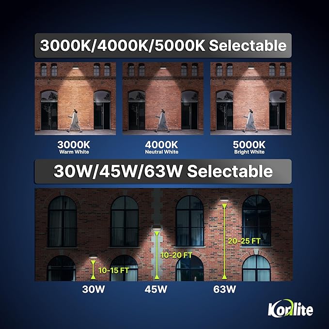 - Flexible Lighting Choices - The Konlite KWPD LED wall pack offers 63W (9,160-10,217LM), 45W (6,615-7,335LM), and 30W (4,440-4,890LM) options, along with 3 color temperatures (3000K, 4000K, 5000K) for tailored illumination, ensuring optimal visibility for indoor and outdoor spaces. The dimensions of the light are 14.33"W x 7"D x 9.26"H.