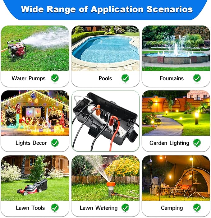 - WIDE APPLICATIONS:Ideal for a variety of outdoor & indoor applications including patio, lawn and garden power tools,holiday lighting, landscape decorations, pool pumps, fountains, fish ponds, patio heaters, hot tub, air conditioners, security cameras and more.