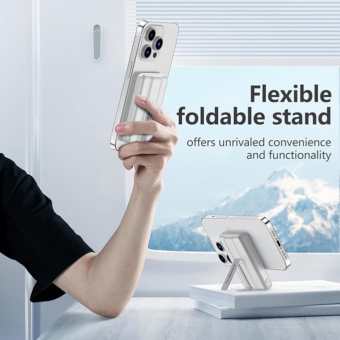 - [Versatile Stand] Need to keep your device upright while it charges? Our Wireless Power Bank features a built-in stand, allowing you to prop up your phone at the perfect viewing angle. Enjoy hands-free video calls, movie marathons, or simply keep an eye on notifications while your device is charging.