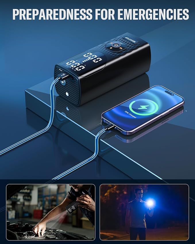 - 【Inflator, Power Bank and Flashlight】The Q7 is more than just a tire inflator, it's also the power bank for charging your digital devices outdoors. In addition, it comes with a 400 lumen flashlight that plays an important role in inflating tires in the dark, changing tires, or warning other vehicles at night.