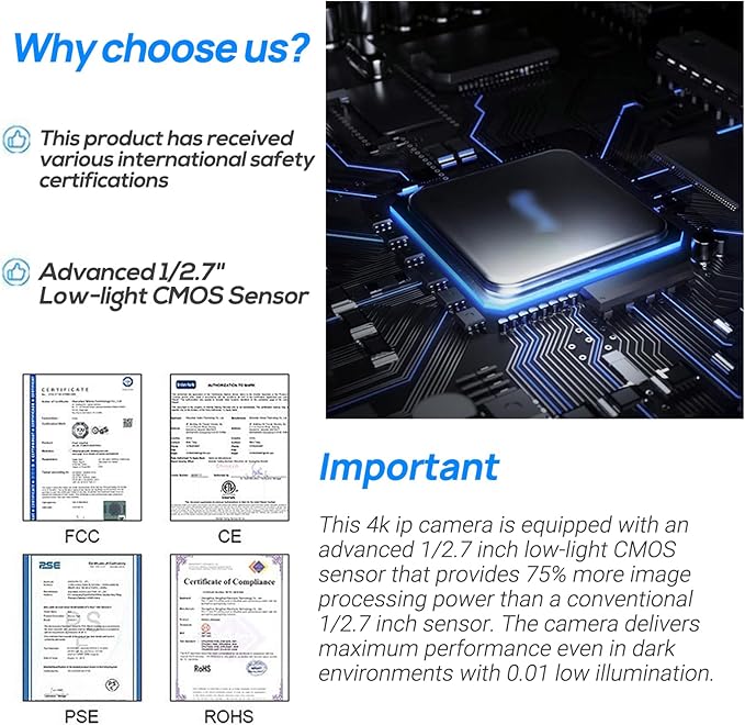 - 【Indoor/Outdoor IP67 Camera with Audio】-This 8mp 4k ip turret camera adopts advanced image processing and optical technology to still provide clear images in extremely low-light environments, achieving unparalleled low-light capabilities.Heavy-duty metal weatherproof IP67 enclosure, which can still work normally after being immersed in 1m deep water for 30 minutes.8mp poe camera built-in mic audio recording (one-way audio),real-time capture of the sound around the camera,don't miss any details