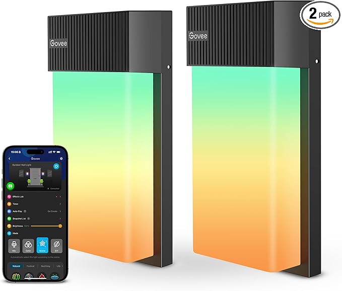 Govee Outdoor Wall Light, 1500LM Smart RGBIC Porch Lights Outdoor with 45 Scene Modes, IP65 Waterproof for Outdoor Decor, DIY Lighting Effects, Works with Alexa, Google Assistant and Matter, 2 Pack