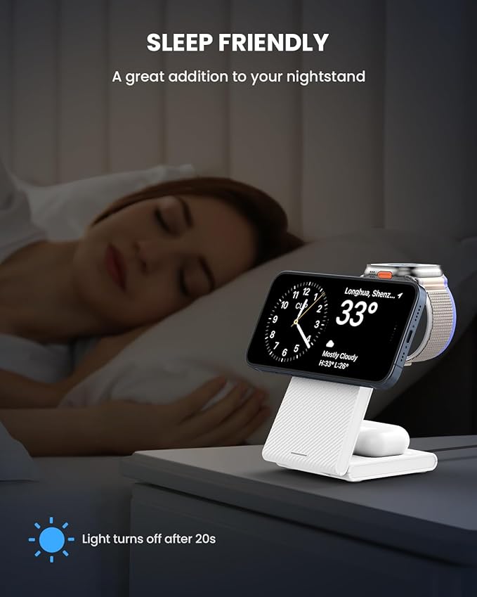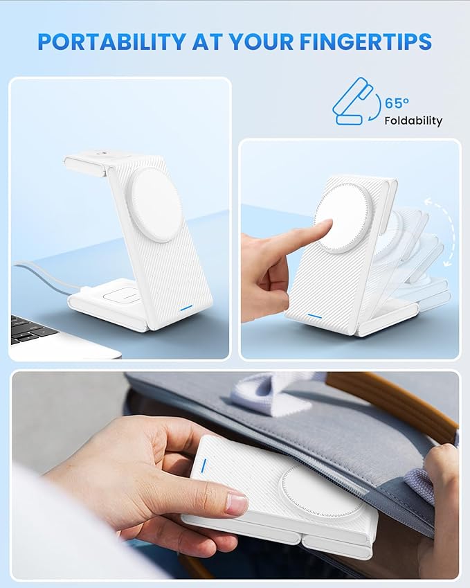 - 👍【Travel Essentials: Portable & Foldable】This 3 IN 1 charging station can be folded 180° into a wireless charging pad smoothly, small and not bulky, bring this 3in1 charger and put in a bag or suitcase when you are traveling or on a business trip, no extra cords, no separate chargers needed, what a minimalist & eco-friendly life!
