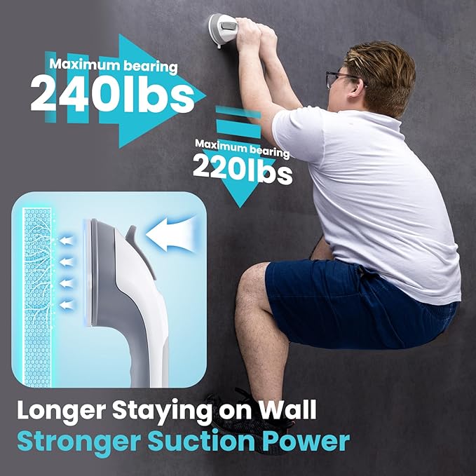 - Easy for Installation: Each suction cup shower handle equips 2 Strong suction cups with locking latches to provide stable protection. The bathtub hand rail ONLY needs to pull down the latches with 5 seconds and the installation is done, quickly and effortlessly! NO drilling, NO screws, NO glue and NO tools are required, fully removable, reusable and causing no damage to your wall