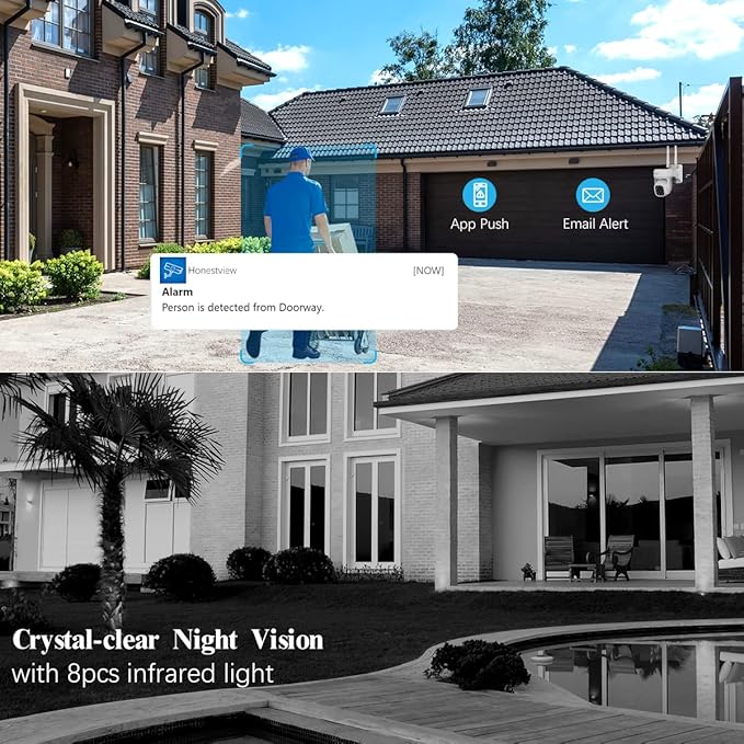 - {5MP Camera & Comprehensive Viewing Angle} Equipped with 4Pcs 5-Million-Pixel PTZ cameras with Super CMOS, the camera enables a crystal clear viewing on your security system. The PTZ camera can rotate all around, which avoids a dead end of surveillance-- 355°horizontally & 95°vertically. viewing angle let you monitor wider areas to protect the safety of your family and property.