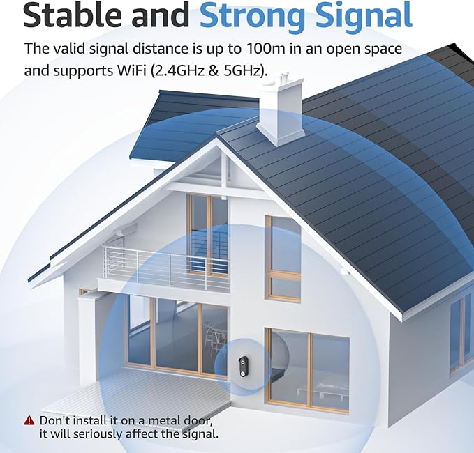 - 【Easy Installation, True Wireless】No cables, no wiring, no drilling required. Install the doorbell camera in just 5 minutes, making it user-friendly for the elderly and girls. It supports WiFi (2.4G and 5G) and 915MHz frequency signal transmission, providing better penetration performance. The effective signal distance can reach up to 60 meters in open spaces. Compatible with the "TuyaSmart" app, allowing you to conveniently control the wireless doorbell camera system from your phone.