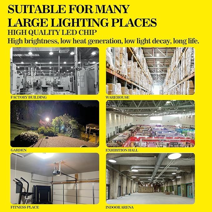 - Perfect for Industrial & Outdoor Use:IP65 waterproof rating ensures reliable performance in garages, warehouses, high bays, workshops, gyms, and outdoor areas (gardens/streets).