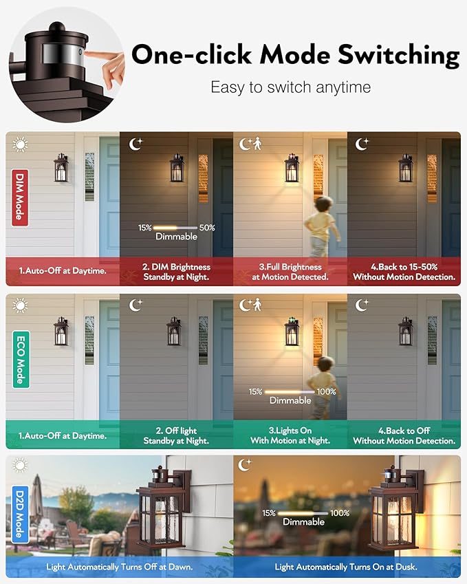 - Advanced Motion Sensors:VIANIS porch lights outdoor with motion sensor incorporate 3 working modes. ① DIM MODE: 30% brightness at night that shifts to 100% light once motion is detected. ②ECO+ MODE: full off at night that transforms into 100% light once motion is detected. ③OVERRIDE MODE: maintains 100% brightness at night. Light will automatically turn off during Dawn in each mode.
