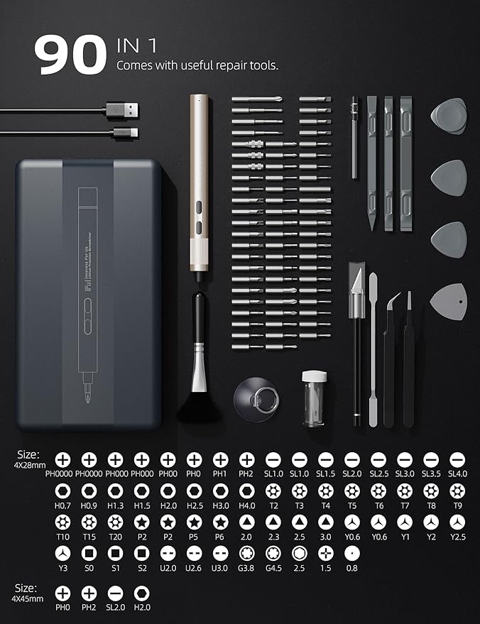 - Screwdriver Set is 90-in-1:this set includes 64 self-magnetic bits, 4pcs 50mm long bits, and various 28mm long bits across 10 categories, all made from durable S2 hardened steel. The package also includes a Mini Electric Screwdriver, Storage Case (with magnetizer/demagnetizer), 22 Accessories, USB Type-C Charging Cable, and User Manual.