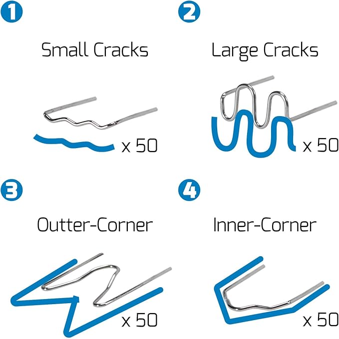 - Plastic welding kit: Our plastic welding tools kit include a pair of cutters, 200 pcs of hot staples (50 each for outer corner cracks, inner corner cracks, small/straight cracks, large/curved cracks.) and a 110V WEP 960-V plastic welder. Our hot stapler plastic repair kit is suitable for a wide range of environments with built-in LED light. The light provides consistent lighting directly on the plastic weld point for low-light environment, this tool is a perfect addition to your tools kit.