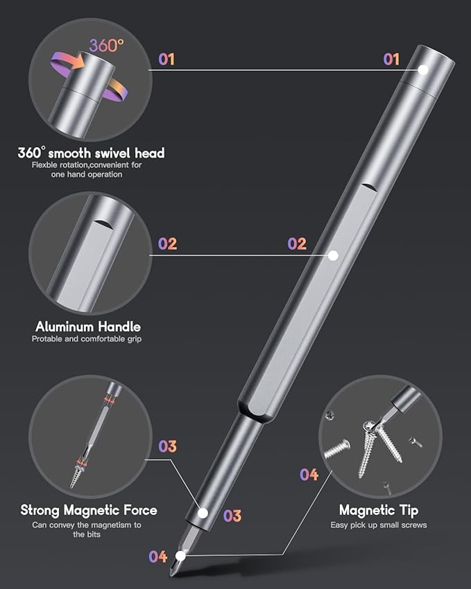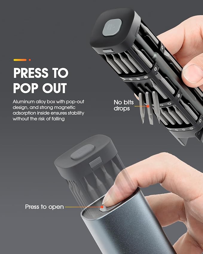 - [PORTABLE & EASY TO CARRY] The bit, screwdriver slot, and storage box core all boast strong magnetism, ensuring a secure hold for the bits. The portable micro screwdriver set is impressively compact and stylish, giving off a high-end and refined vibe when you hold it. It effortlessly fits into your pocket, tool bag, or backpack.