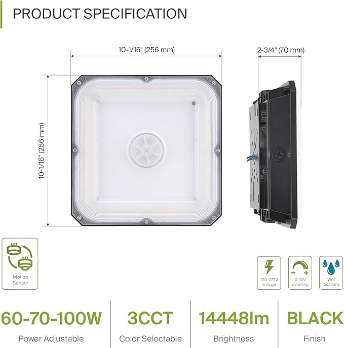 ASD LED Canopy Light 100/70/60W with Q-Base – 3000/4000/5000K 14448Lm 10"x10" 120-277V IP65 Dimmable 0-10V UL & DLC Listed (Optional Motion Sensor-Extra Purchase)