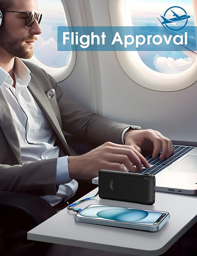 TG90° 10000mAh Portable Charger with Built-in AC Wall Plug and Cables, Ultra Slim USB C Power Bank External Battery Pack Compatible with iPhone and Android Phones