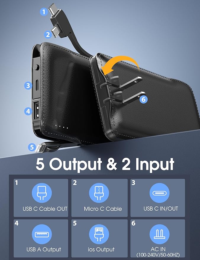- Power Bank Built-in Cables: All-in-one portable cell phone charger not only has an AC plug, but also has two charging cables No more worrying about forgetting to bring extra cords Great travel accessories for a trip