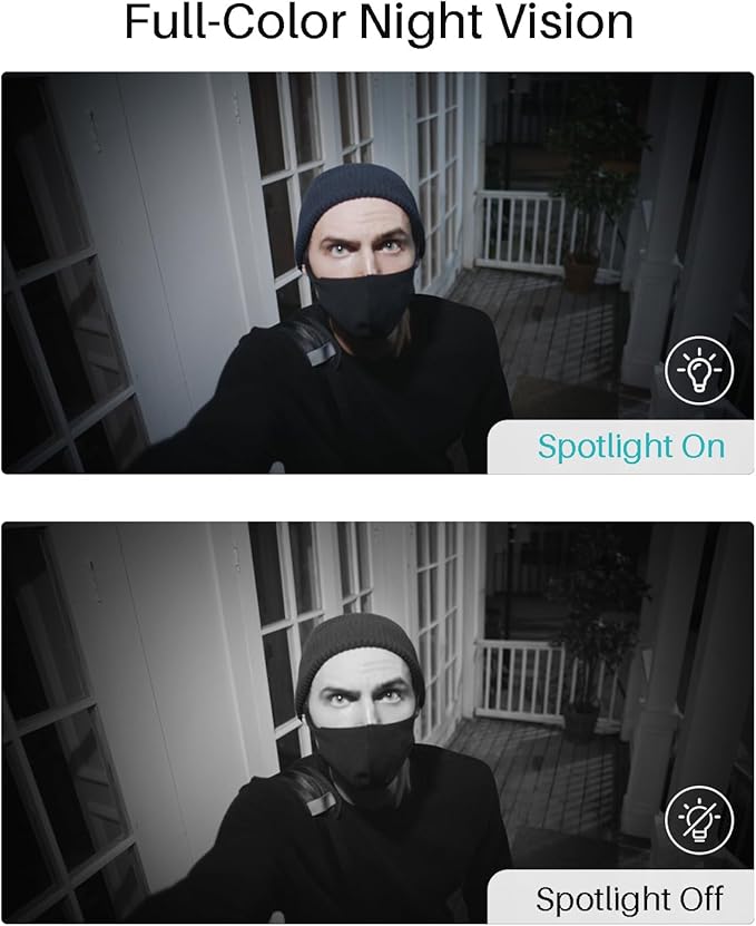 - 【2K Clearer Video】Picture Quality is 65% improved from 1080p. With a 135 degree wider viewing angle and 10x digital zoom, every detail of your property is in your hand. Integrated spotlight and color night vision make it clear at night.
