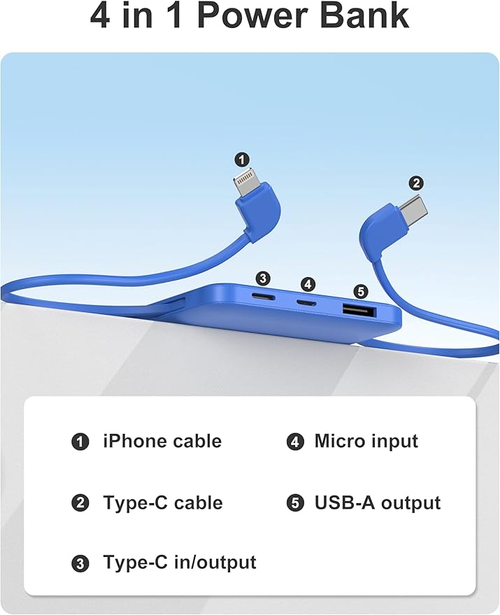 - Portable charger with built in cables: This power bank is built-in type C cable and other cables that compatible with mobile phone directly, such as for iphones, for iPad, for Samsung, for other USB C port phones. You do not need to take charging cables