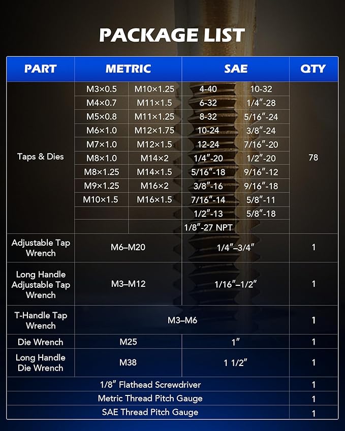 - All-in-One Threading Tool Kit: Orion Motor Tech's 86-piece tap & die set includes 78 taps and dies in common SAE (4-40 to 5/8"-18) and metric (M3 to M16) sizes, 5 adjustable tap and die wrenches, a 1/8" flathead screwdriver, and 2 thread pitch gauges