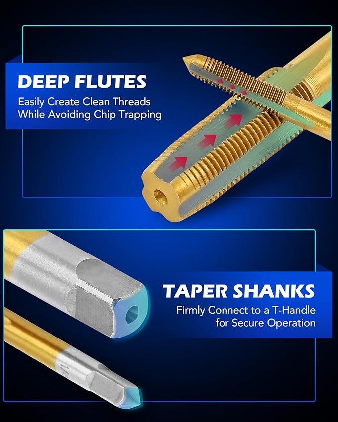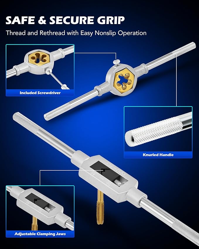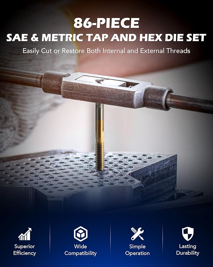 - Thread Like a Pro: Cut and restore internal and external threads effortlessly with our SAE and metric taps and dies, ensuring clean and precise threads on a variety of materials, including wood, copper, aluminum, iron, steel, and more