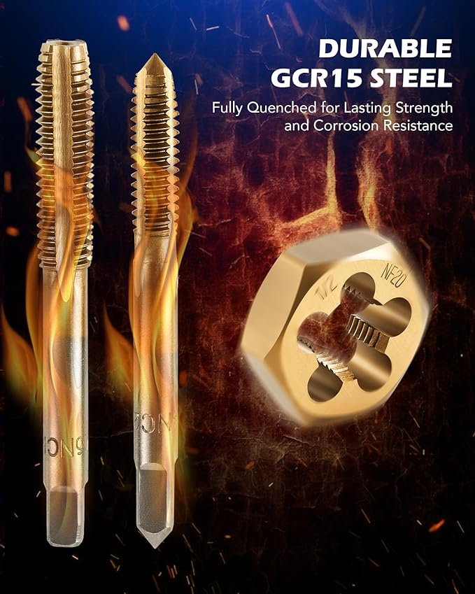 - Built for Durability: Made from GCr15 bearing steel with a titanium coating, this threading tool kit ensures exceptional strength, durability, and corrosion resistance for any tough internal and external threading tasks