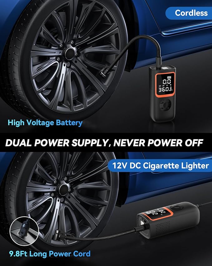 - PRECISION & QUICK TIRE INFLATOR: Equipped with high capacity rechargeable battery, say goodbye to fast battery drain, low power and frequent charging. Tire inflator portable air compressor can run continuously for 1-2 hours without external power supply while working. With 3 times faster inflation speed, it can inflate small car tires (27-36PSI) in 1 minute. If the inflator runs out of power, air pump also comes with a 3-meter DC 12V cigarette lighter that can be connected to the car for power. Never worry about running out of power on the road again, ideal for inflating cars, motorcycles, bikes, bicycles, balls and other inflatables.