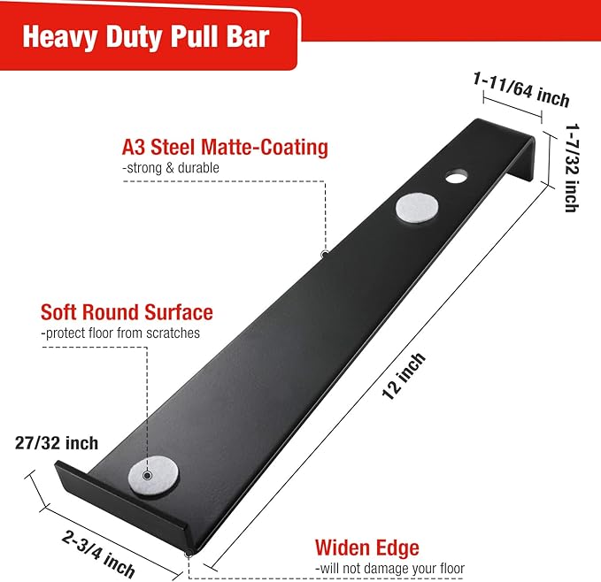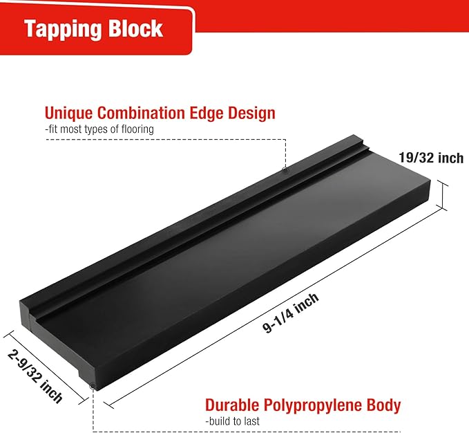 - Enhanced Pull Bar & Tapping Block : The flooring puller bar is made from premium steel with matt coating with high strength and corrosion resistance. Designed with 2-3/4inch wide front edge and soft pads on the back help to prevent damaging and scratching your plank during installation. The tapping block is made from solid and resistant polypropylene. Suitable for 0.27in (7mm) - 0.6in (15mm) laminate or hardwood flooring