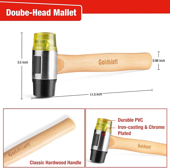 - Reinforced Mallet : Constructed of cast iron with bright chrome plating, the hammer is equipped with the hardness of 90±5 HAS. The double-faced solid PVC head delivers a softened, positive strike. The mallet head is 1-3/8 inch in diameter. The handle is made of classic hardwood handle which is lightweight but tough. The whole mallet is 11-1/2 inch long and weighs 0.76lb.