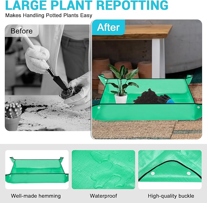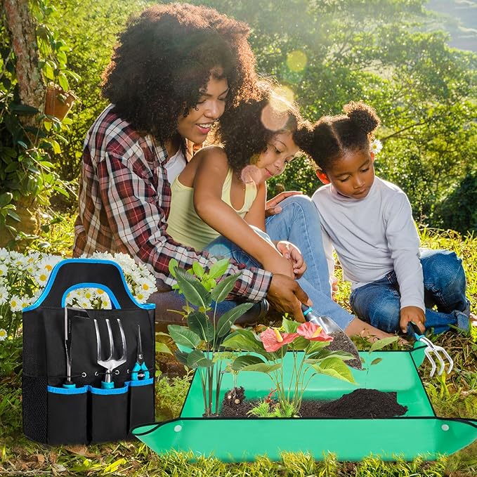 - ENHANCED GARDENING EXPERIENCE - Large repotting mat inclueded in our yard tools kit simplifies indoor gardening. It eliminates the need to bend over, allowing for comfortable transplanting from a kitchen counter. The ergonomic handles, made from high-quality TRP, provide a comfortable grip for hands of all sizes, reducing strain and effort during use.Unleash your green thumb with our garden tools and create your dream garden