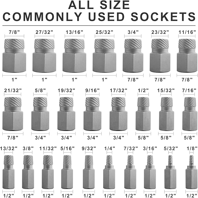 - 【COMPLETE SET WITH STORAGE CASE】 Our set includes all the sizes that will on any working spot. A total of 25 unique removing screws and bolts tools ranging from 1/8 inch (3.5 mm) to 7/8 inch (23 mm) in 1/32-inch increments. The full tools extracting set comes in a diligently moulded case in which each piece has its own spot for storage and carry around