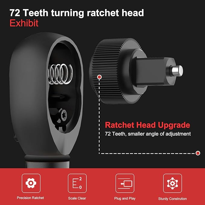 - 4.Dual-Direction Capability with 72-Tooth Design & Quick-release Button: Offering versatility, this 1/2 torque wrench can measure both clockwise and counterclockwise forces thanks to its dual-direction drive capability.Its 72-tooth design allows usage in tight spaces while a quick-release button ensures efficient loading and unloading
