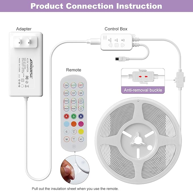 - Multifunctional: MIWISE RGB COB LED strip light has three built-in music effects, ROCK/POP/R&B. Supports three control methods: IR remote control, smartphone APP, and control box. Support white tunable function, C/W, C/T±. You can choose cool white/warm white according to your needs. (Note: The white light of RGB COB LED strip lights is obtained by mixing multiple colors, which is a little different from ordinary single color temperature COB LED strip lights)