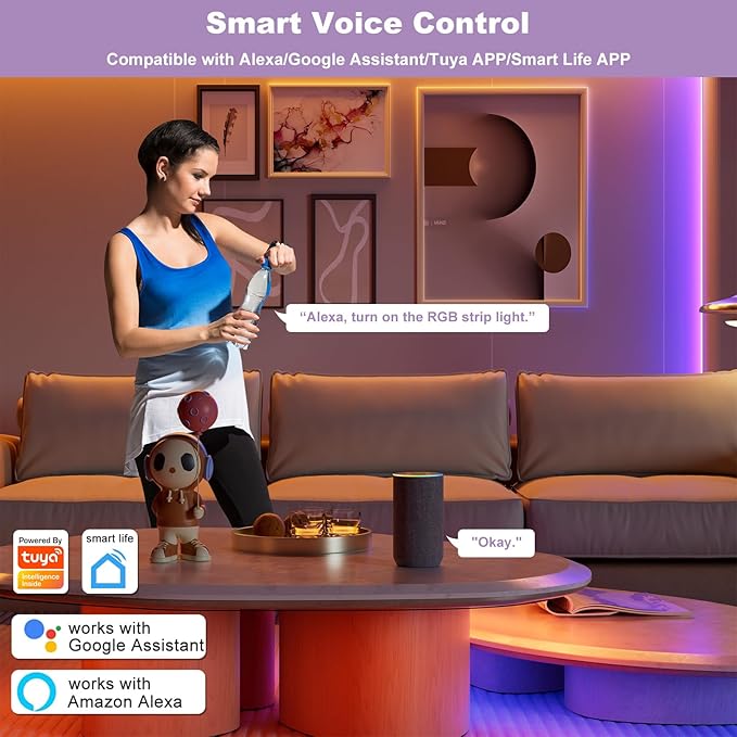 - Voice Control: Compatible with Alexa/Google Assistant/Tuya/Smart Life APP. With voice control, you can control your lights even easier! You can add the "Smart Life" or "Tuya" skills in Alexa/Google Assistant and add your strip lights to the interface. Note: Please be sure to follow the steps in the APP to add the strip light to your device (supports 2.4 G Wi-Fi or Bluetooth).