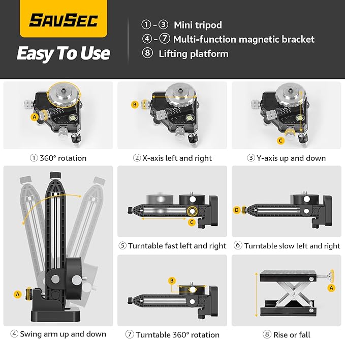 - One-stop service: 1x magnetic wall brakect; 1x iron plate; 1x lifting platform; 1x 360° ratoting mini tripod; 1x window clip; 1x threaded conversion adapter. Complete accessories, providing at least 6 installation methods for the lazer leveler tool