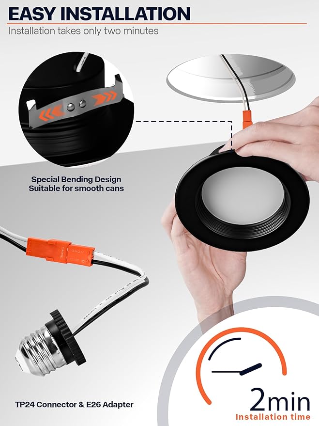- 💡【Easy Install】 The retrofit LED recessed lighting no additional accessories are required. Instead of the traditional springs, they are ready to fit in 4 inch recessed housing cans with C clip. Standard E26 base allows you to easily screw into the can.