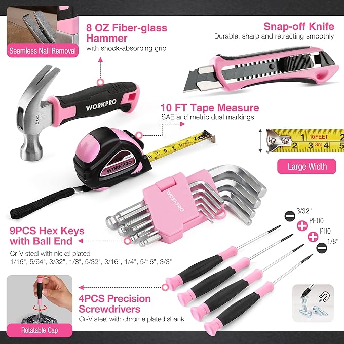 - Convenient storage and portability with our WORKPRO stackable box,comprehensive variety of tools are stored in this durable, dirt-resistant plastic case with molded compartments that keep tools securely in place, with easy access and protection