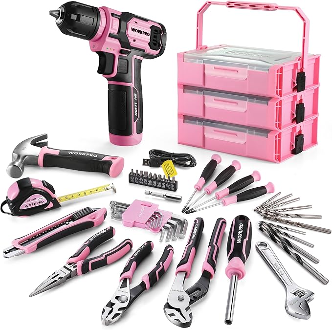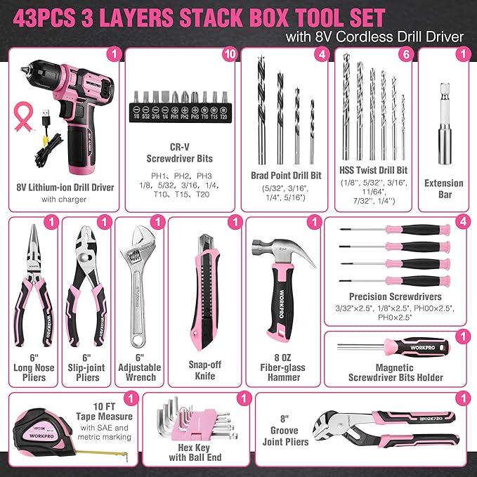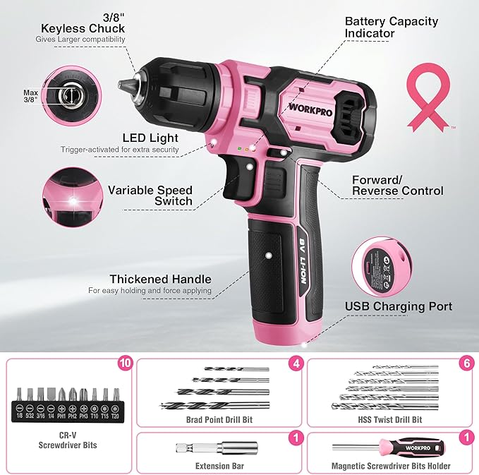 WORKPRO Pink Cordless Drill Driver with Toolbox, 8V Lithium-ion Power Drill and Bits, 2.0 Ah Portable Electric Screwdriver Home Tool Set with Stackable Pink Ribbon Tool Box