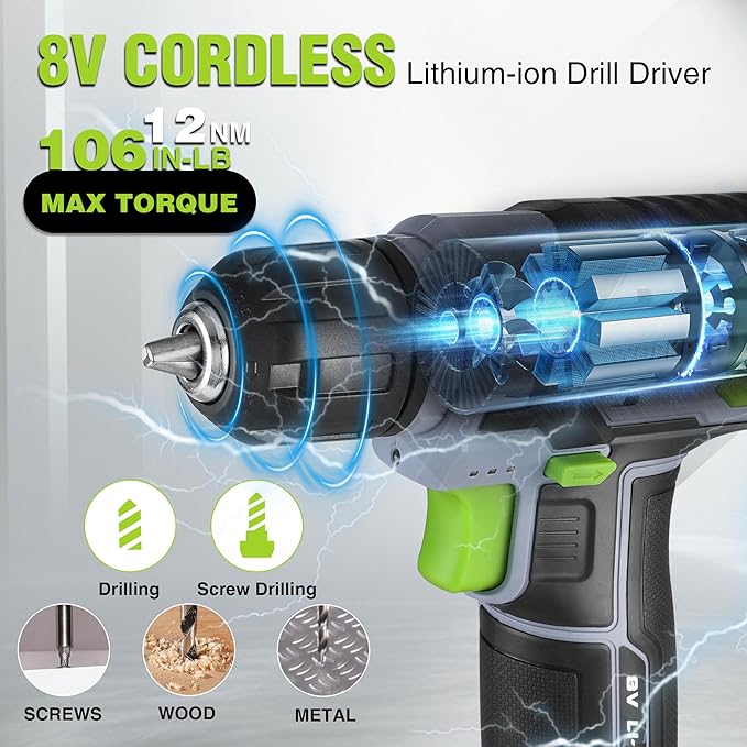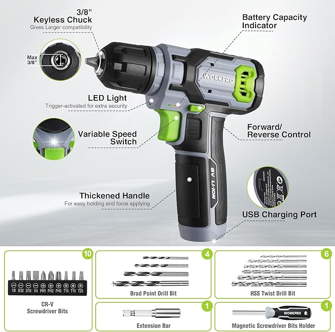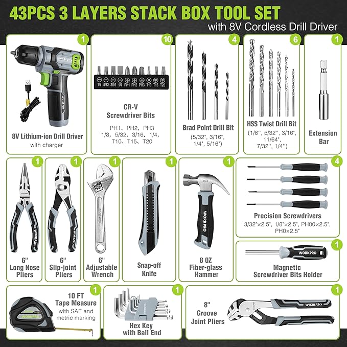 WORKPRO 43PCS Cordless Lithium-ion Drill Driver & Toolbox, 8V 2.0 Ah Power Drill Set with Household Hand Tool Kit, Battery Powered Screwdriver with Stackable Tool Box