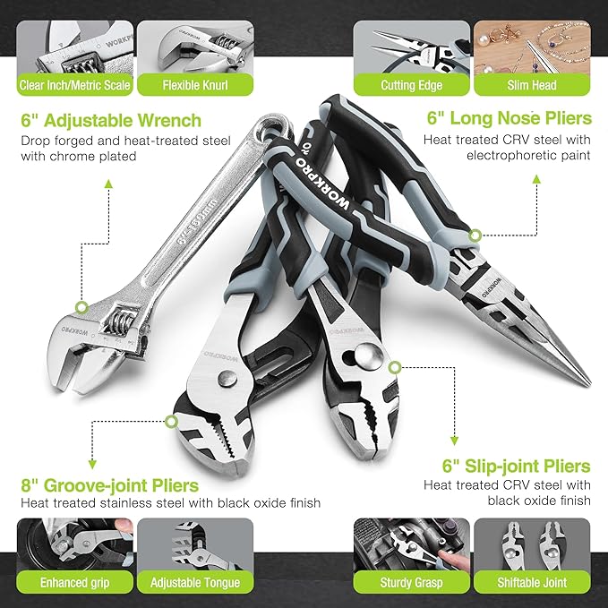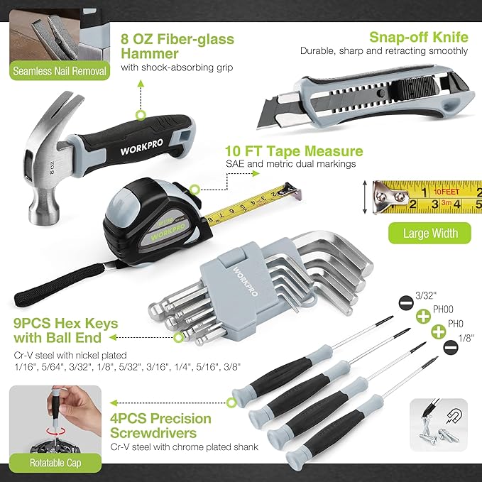 - All-in-one solution for your daily needs, our tool kit for home includes all essential tools needed to tackle any home maintenance task, furniture assembly, picture hanging, general repairs...