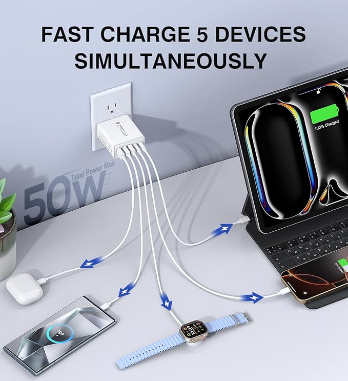- Safe and Reliable USB Plug:The 50 W USB fast charger station has a built-in smart chip with GaN technology that automatically matches the current required by your device, preventing it from short-circuiting, over-current, over-voltage, overheating and over-charging. Meanwhile, the USB charger block is made of ABS + PC fire-resistant material, ensuring that your digital devices are always safely charged 24 hours a day