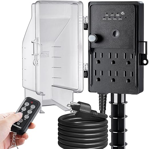 - Versatile setup & easy installation: Designed for outdoor use with Christmas lights extension cord, Halloween decorations, and more; outdoor power stake timer waterproof with remote control for convenient management; longer and thicker stake for stability in various environments