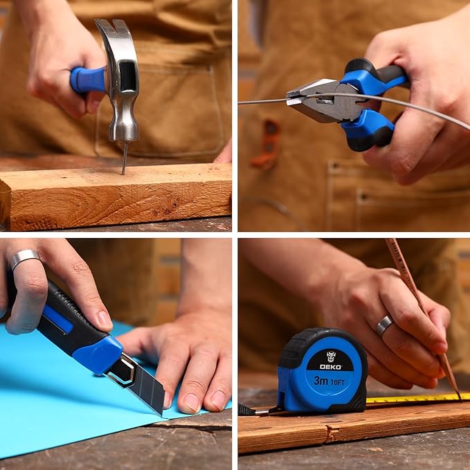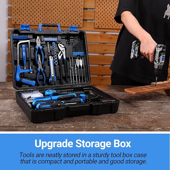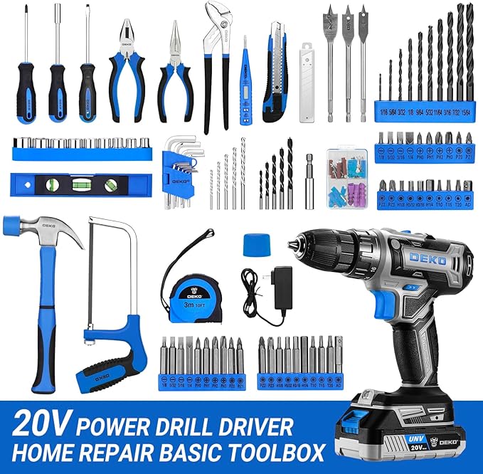 - 【ALL TOOLS IN ONE TOOLBOX】This household tools kit contains the most useful and necessary tools in one box storage as the origanizer of tools sets: 20V battery power drill set and combo kit, screwdrivers, saw, hex key, bits, sockets, drive spinner handle, tape measure, claw hammer,hammer cap,adjustable wrench, level, pliers set and plastic toolkit case etc.